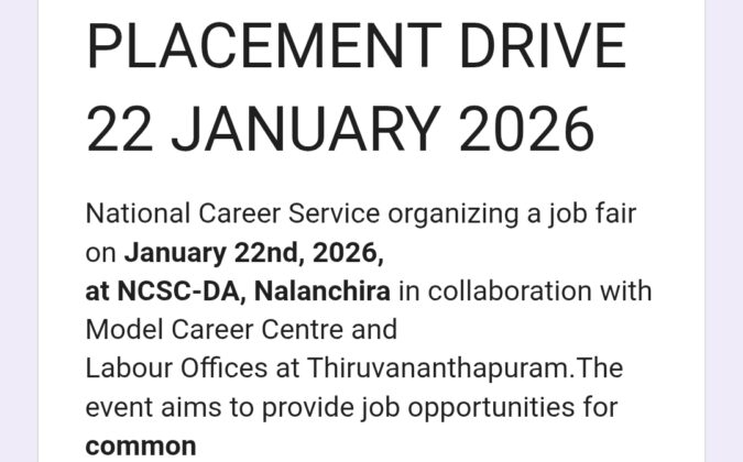 കേന്ദ്ര തൊഴിൽ മന്ത്രാലയത്തിന് കീഴിലുള്ള നാഷണൽ കരിയർ സർവ്വീസ് സെന്ററിന്റെയും പ്ലാനിംഗ് ബോർഡ് കേരളയുടെയും ആഭിമുഖ്യത്തിൽ തൊഴിൽ മേള 2026 നാലാഞ്ചിറ ദേശീയ തൊഴിൽ സേവന കേന്ദ്രത്തിൽ നടക്കും. ജനുവരി 22 ന് നടക്കുന്ന മേളയിൽ തിരുവനന്തപുരം, കൊല്ലം ജില്ലകളിലെ ഉദ്യോഗാർഥികൾക്ക് പങ്കെടുക്കാം. തൊഴിൽ മേളയിൽ ഐ.ടി, ഓട്ടോമൊബൈൽ, മാനേജ്മെന്റ്, ടെക്നിക്കൽ, മാർക്കറ്റിംഗ്, ഇൻഷുറൻസ് മേഖലകളിലെ തൊഴിൽ ദായകർ പങ്കെടുക്കും. എല്ലാ തരത്തിലുള്ള തൊഴിൽ അന്വേഷകർക്കും മേളയിൽ പങ്കെടുക്കാം. പ്ലാനിംഗ് ബോർഡ് മെമ്പർ ഡോ. രവി രാമൻ മേളയും ഉദ്ഘാടനം നിർവഹിക്കും. ഡെപ്യൂട്ടി ഡയറക്ടർ ജനറൽ അഞ്ജലി റാവത്ത്, ഡയറക്ടർ ഡോ ശിഖാ ആനന്ദ് എന്നിവർ പങ്കെടുക്കും. എല്ലാ തരത്തിലുമുള്ള തൊഴിൽ അന്വേഷകർക്കും ഈ തൊഴിൽ മേളയിൽ പങ്കെടുക്കാം. ഉദ്യോഗാർഥികൾ https://forms.gle/zZ8G8FknBABaApDW7 രജിസ്റ്റർ ചെയ്യണം. കൂടുതൽ വിവരങ്ങൾക്ക്: 8590516669, 0471-2530371.